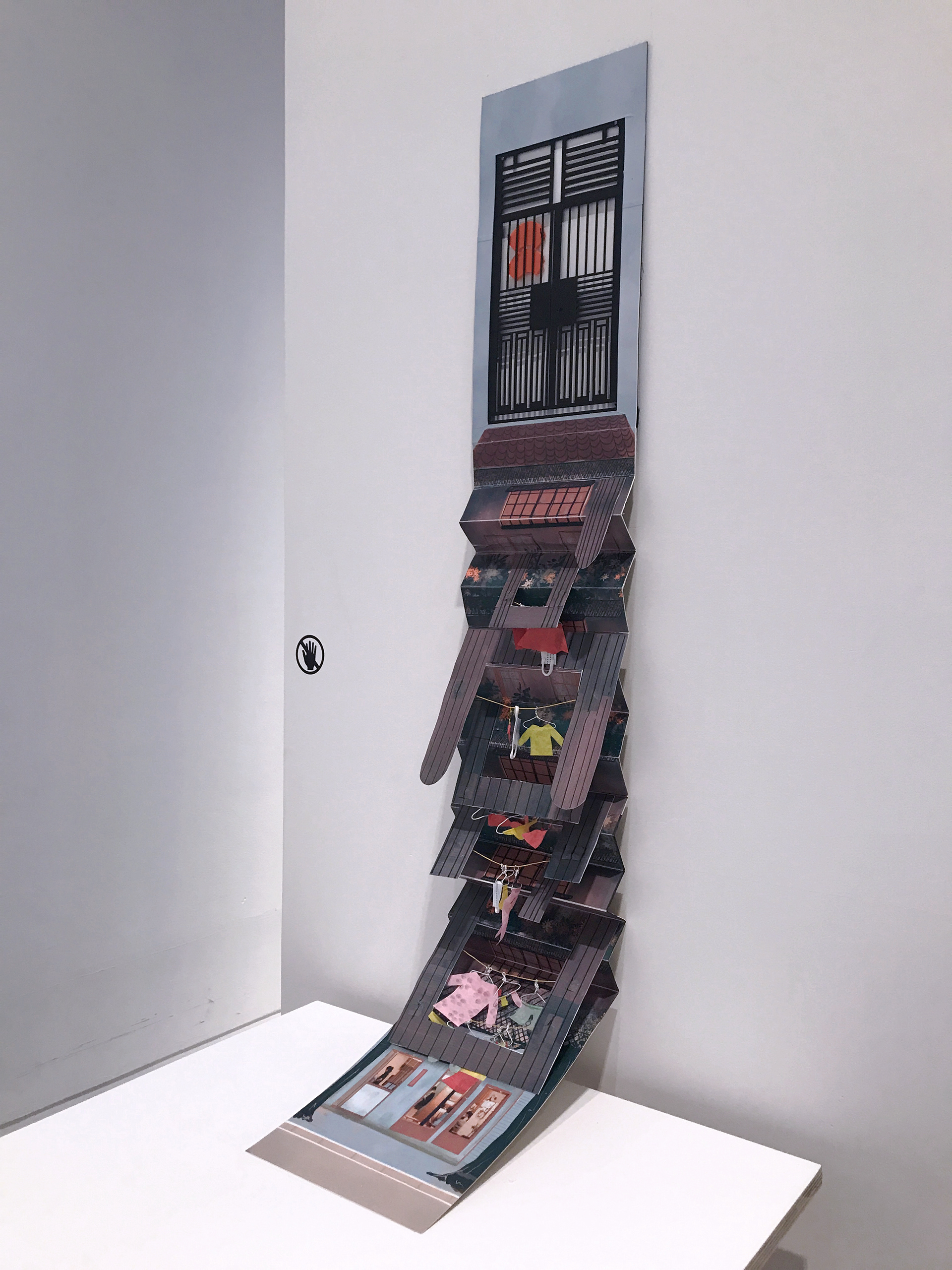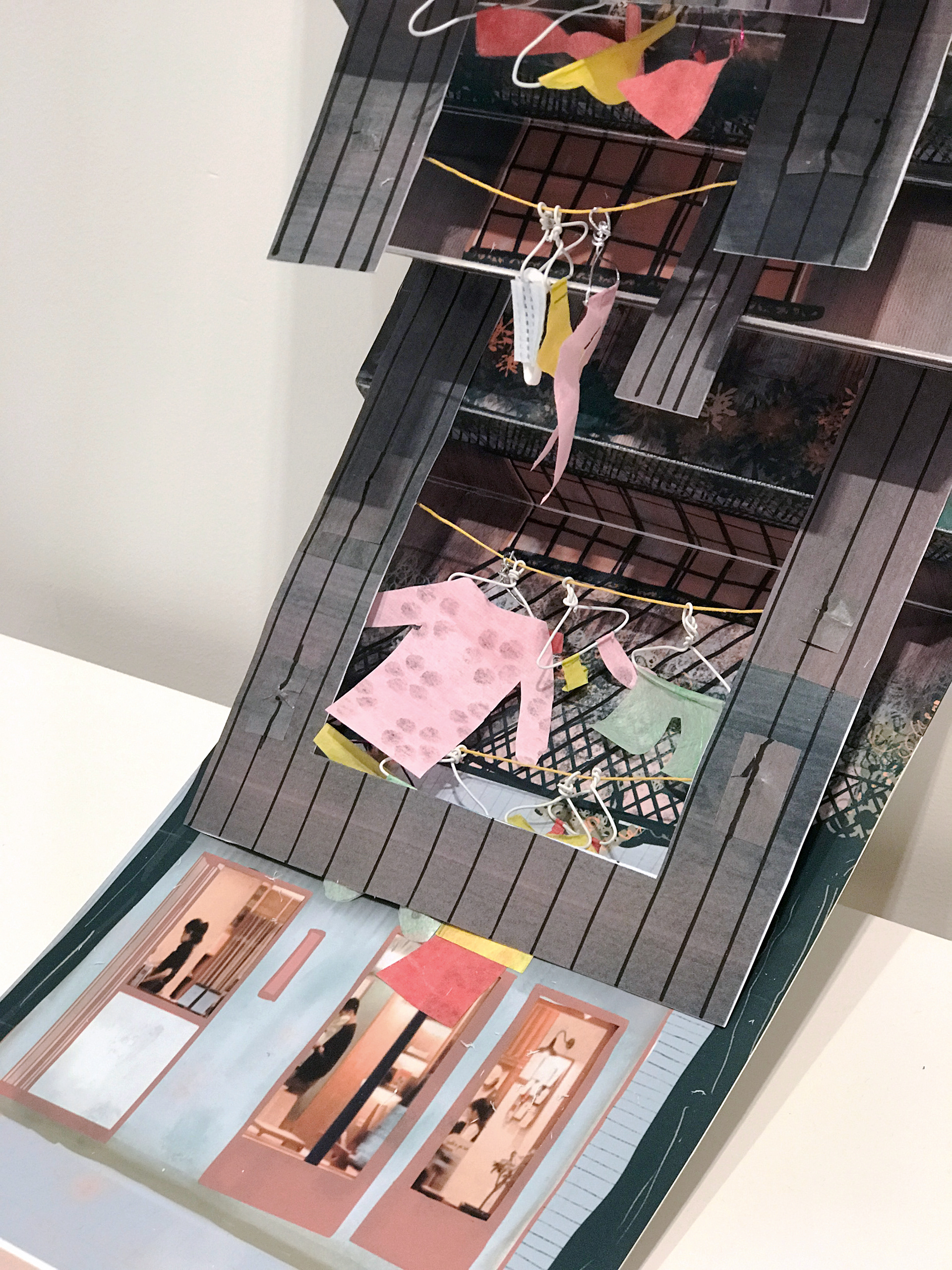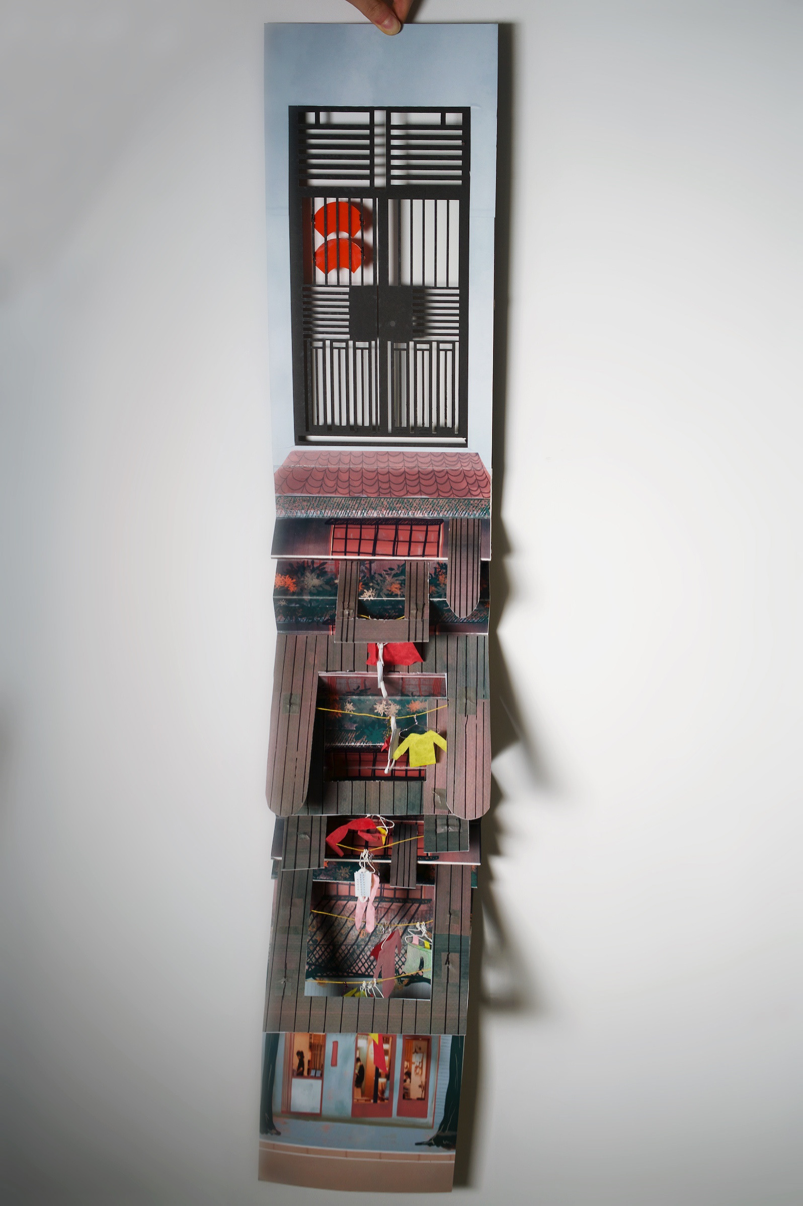 After investigating a few distinct neighborhoods following a collaboratively constructed Derive, our interest arrived at the clothesline. An unassuming and ubiquitous sight, the clothesline has grown to be a metaphoric site of contention, engendering debates surrounding urbanization and gentrification, among other things. Our work makes these issues visible through a number of carefully planned juxtapositions. Through the contrasts in color and materiality, we question the nature of the boundaries between the public and the private, as well as the ethics behind breaching these intangible spheres by various stakeholders. We see the flag book as an ideal medium for our vision. Its accordion structure — with its two-way ridges and many folds — affords us the possibility to introduce the surprising and unexpected, symbolically recreating the physical encounter of such elements while walking in the streets of Shanghai.